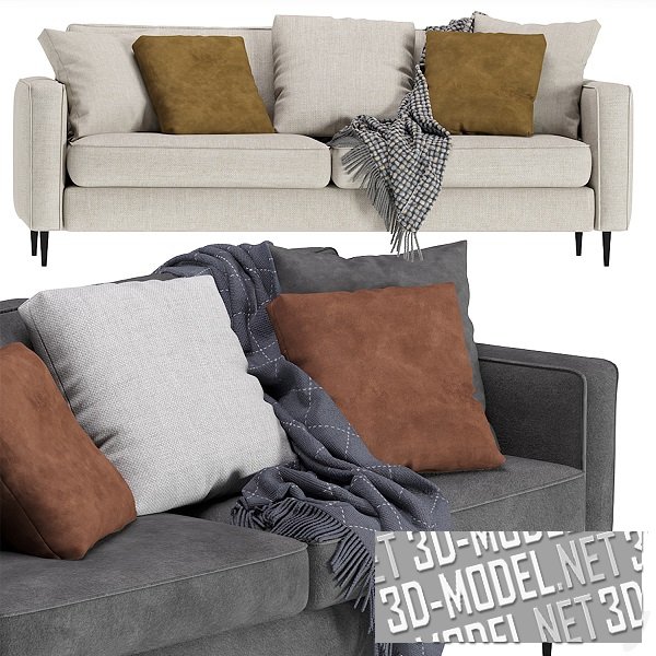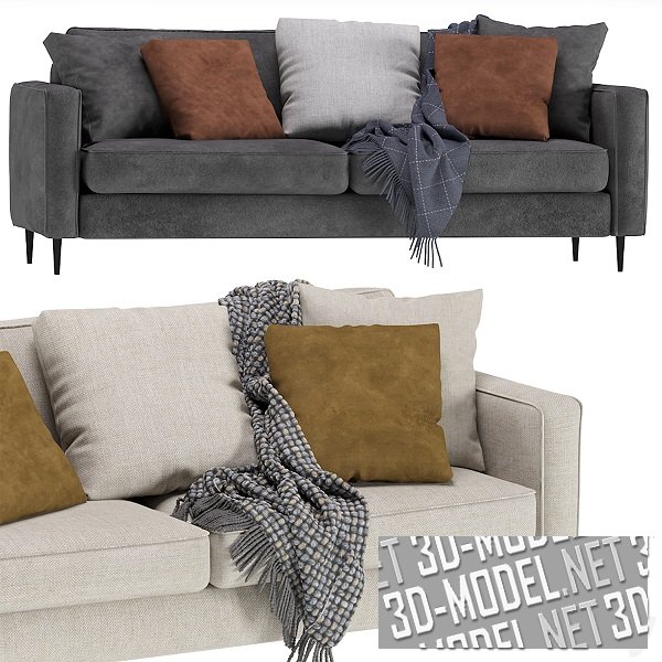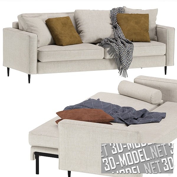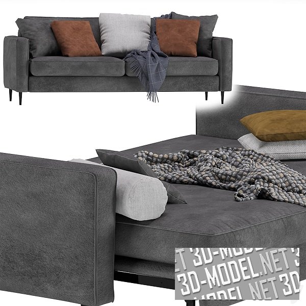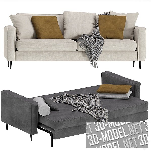 Простой прямоугольный раскладной диван Dissent, на невысоких черных металлических ножках, в собранном и разобранном состоянии. Представлены два варианта обивки: белая и темно-серая. Плед, валик и подушки (серого, белого и коричневого цвета) дополняют модели.