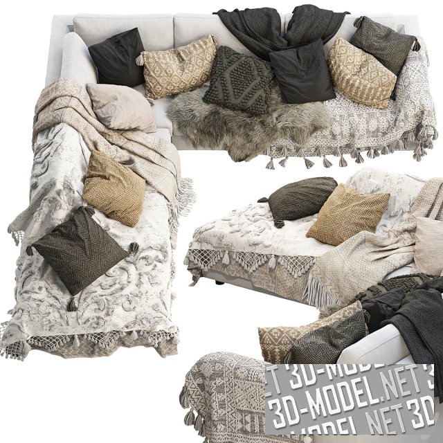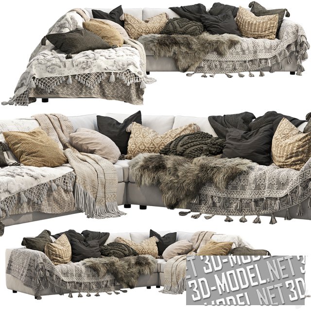 Большой мягкий угловой диван EQ3 Cello с шезлонгом, выполнен в этническом стиле. Диван обтянут серым текстилем и накрыт большими серыми покрывалами, декорированными крупной объемной вышивкой, вязаными элементами и кистями. Плед, большая меховая шкура и множество мягких разнообразных по цвету и фактуре подушек добавляют ощущение теплоты и уюта.