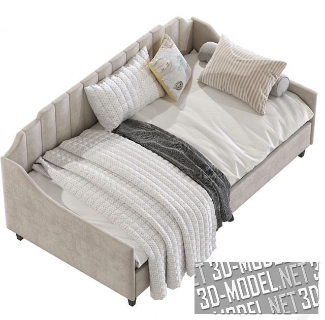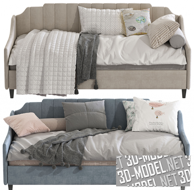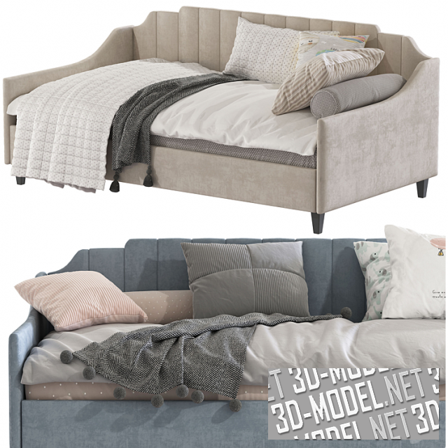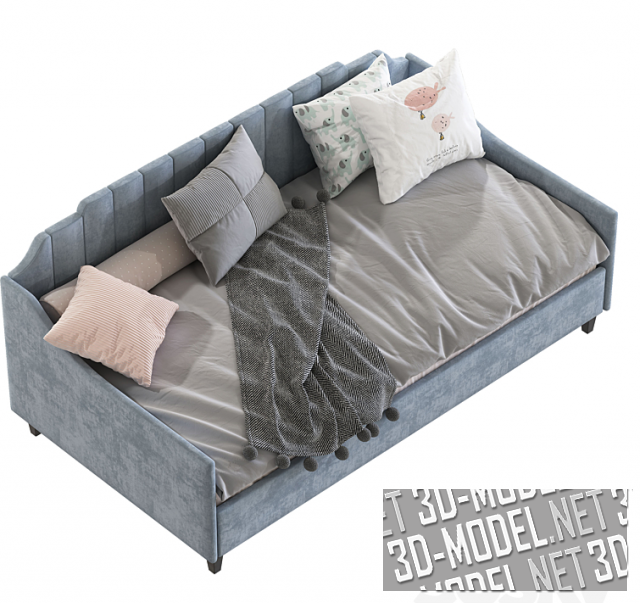 Современная детская диван-кровать Jolena с велюровой обивкой в двух вариантах (бежевом и бледно-синим). Фигурная спинка декорирована вертикальной прострочкой. Невысокие деревянные ножки - черные. Комплекты постельного белья и пледы пастельных тонов, некоторые подушки с детскими картинками. Габарит матраса: 100х190см.