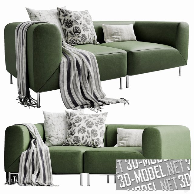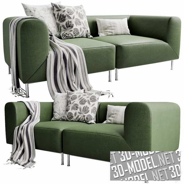 Прямой двухместный диван Miami от Boconcept с текстильной обивкой зеленого цвета. Толстые мягкие элементы сиденья, невысокой прямой спинки и подлокотников установлены на каркасе с ножками из хромированной профильной трубы. Серо-белые подушки и плед отлично сочетаются с обивкой дивана. Габарит дивана: 190х95х67см.