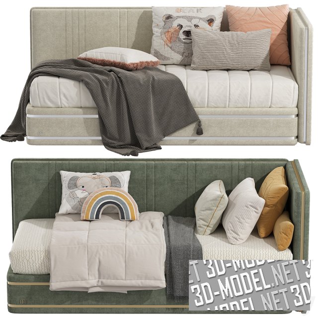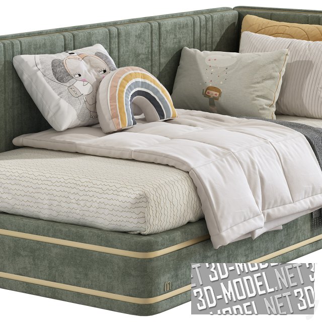 Уютный диван-кровать Micasa для интерьера детской комнаты. Диван имеет две высокие мягкие боковины, обтянутые велюром оливкового или бежевого цвета и отстроченные декоративными вертикальными полосками. На матрасе, лежащем поверх сиденья - пледы и множество подушек с аппликацией.
