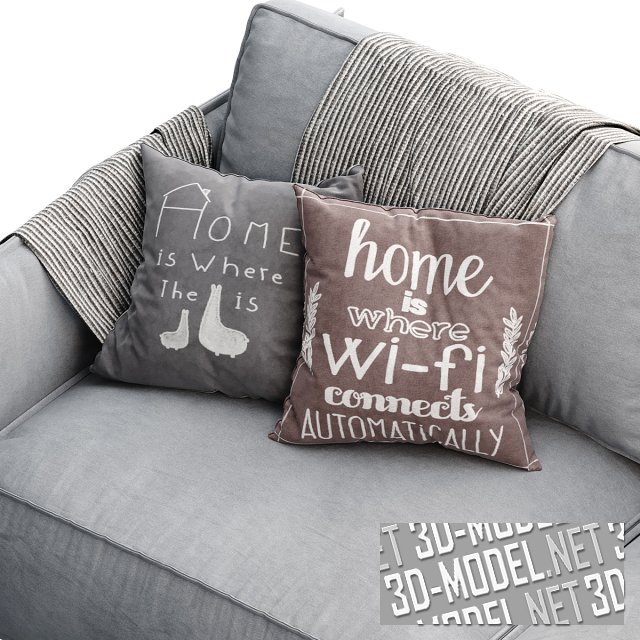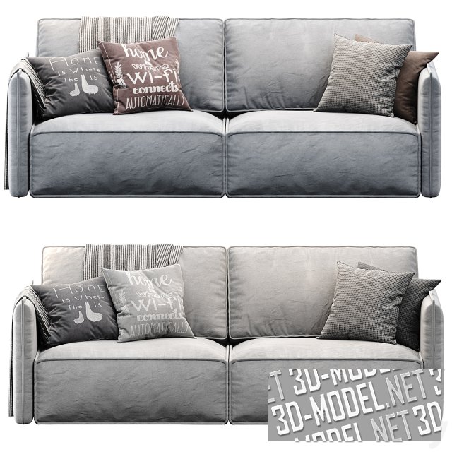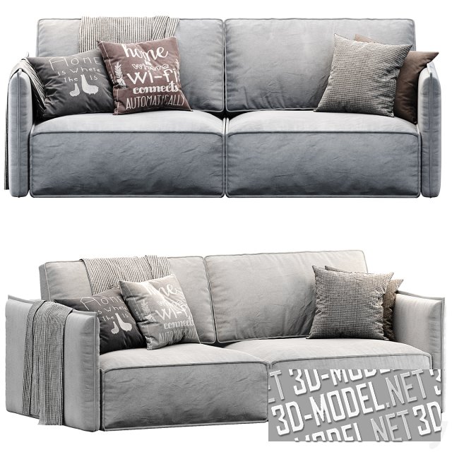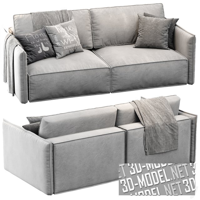 Современный прямой двухместный диван без ножек OLEN от Divan ru. Сиденье и спинка дивана выполнены в виде двух пар крупных прямоугольных подушек. Подлокотники довольно узкие, прямые, с выделенным декоративным швом по периметру. Представлены варианты обивки из ткани серого цвета двух оттенков. На диван наброшен плед в мелкую черно-белую полоску и четыре диванные подушки в серых и коричневых тонах.