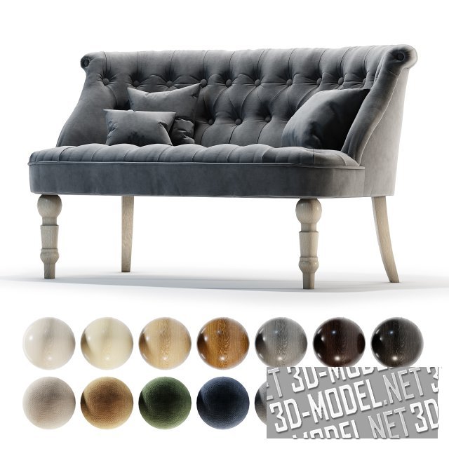 Простежка капитоне декорирует спинку и сиденье. Небольшие диванные подушки позволяют улучшить комфорт и расширить вариативность декорирования дивана. Изготовитель предлагает много вариантов тканей и кожи. Габарит дивана: 143х72х80см. Высота сиденья: 42см.