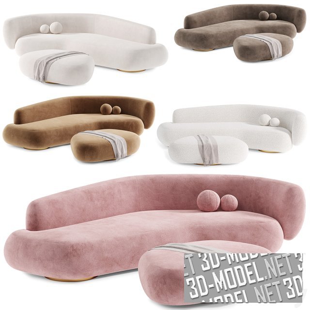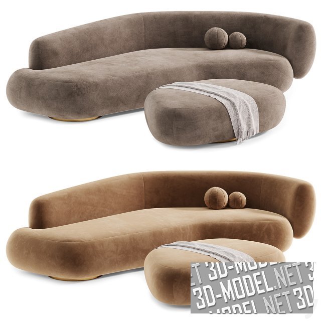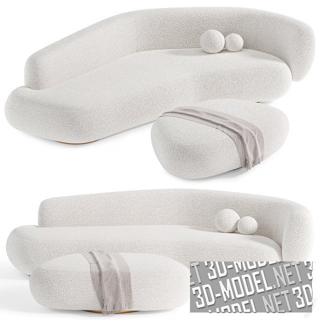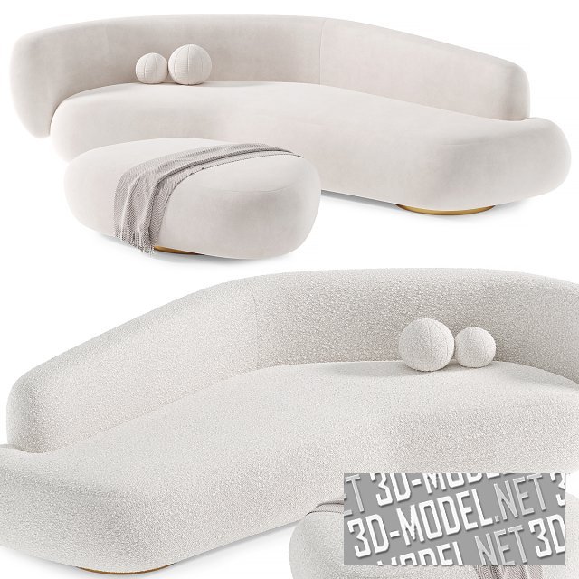 Криволинейный скругленный диван OKHA REPOSE от Kookudesign, в комплекте с подставкой для ног. Низкая спинка дивана повторяет форму корпуса, плавно переходя в подлокотник-изголовье в правой или левой части корпуса. Вместо декоративных подушек диван украшен двумя мягкими шарами из той же обивки, что и весь диван. Из под корпуса просматриваются широкие невысокие золотистые опоры ножек. На овальный пуфик подставки для ног наброшен светло-серый плед с бахромой. Велюровые обивки представлены в нескольких вариантах: белом, розовом, карамельном и какао. Габарит дивана: 300х260х78см.