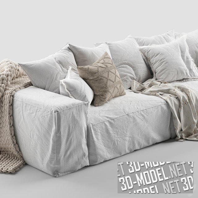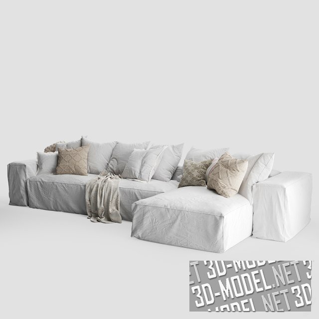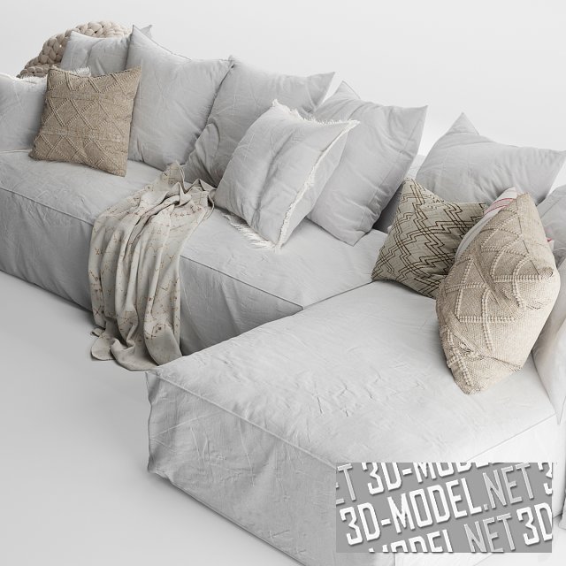 Мягкий угловой модульный диван Hendrix Uniqwa в белых чехлах. Габарит дивана: 408х173х60см. Лаконичные формы и цвет дивана немного разбавлены диванными подушками и пледами в нежно-бежевых тонах. Один плед - крупной вязки, второй гладкий, с легким рисунком. Два чехла подушек изготовлены в стиле макраме. Пара - в чехлах с пестрыми орнаментами в пастельных тонах. Три чехла - белые, с бахромой по периметру.