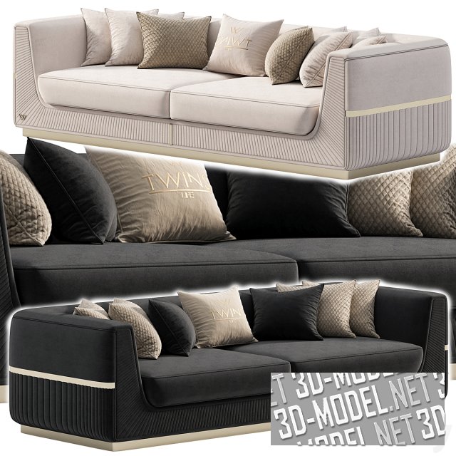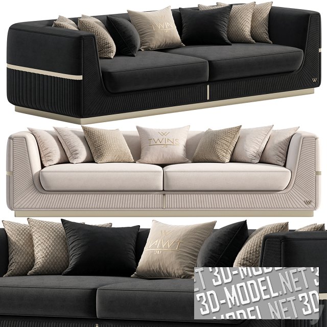 Шикарный диван Lorenzo от Twins для интерьера гостиной. Отделан плиссированной строчкой в нижней части. Диван предлагается в трех вариантах обивки: цвета горького шоколада с коричневыми и бежевыми декоративными подушками; светло-бежевой с подушками такого же оттенка и с темно-графитовой. На центральной подушке - золотой логотип TWINS.
