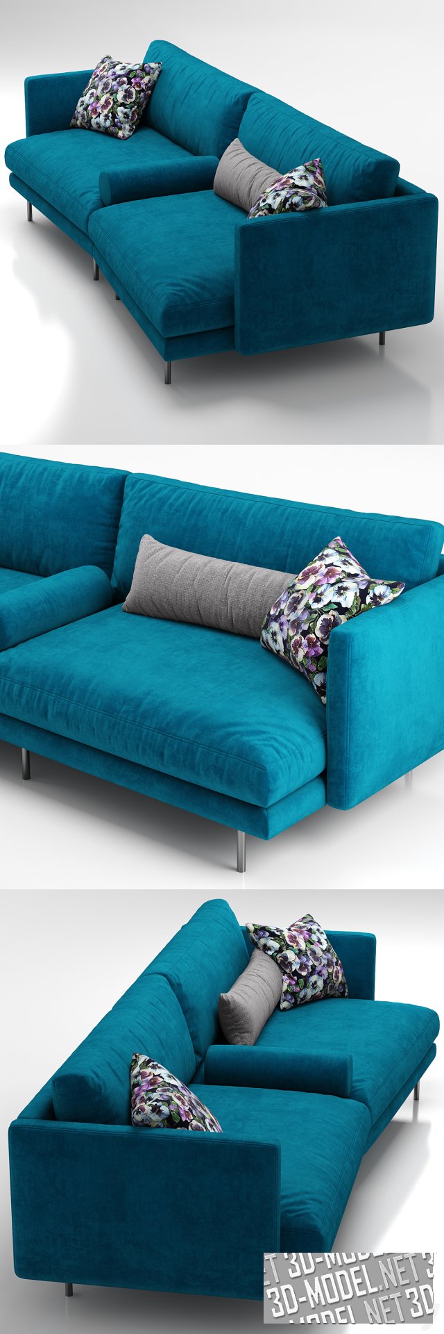 Современный прямой двухместный диван Mies от Calligaris с обивкой ярко-голубого цвета. Прямые подлокотники и две прямоугольные подушки на спинках дополнены небольшим цилиндрическим валиком, разделяющим две подушки на сиденьях. Диван смонтирован на восьми металлических ножках. Серая горизонтальная и две квадратные подушки в чехлах с анютиными глазками увеличат уровень комфорта и добавляют пестрые цветовые пятна к яркой обивке. Габарит дивана: 262х120х84см.