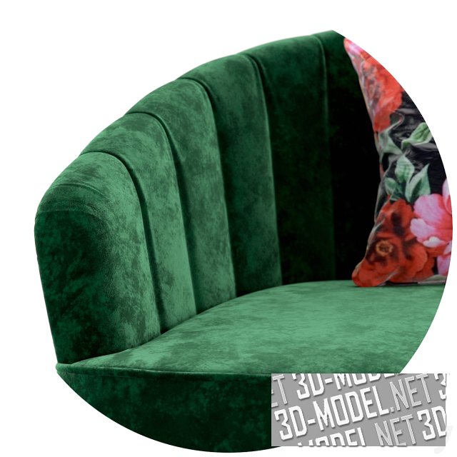 Неразборной двухместный диван Harper от Sofa.com (Ирландия), с криволинейным сиденьем и огибающей спинкой, переходящей в понижающиеся подлокотники. Внутренняя плоскость этого элемента декорирована вертикальной прострочкой. Диван на тонких деревянных, сужающихся книзу ножках обит темно-зеленым бархатом. Пестрая диванная подушка с цветочным принтом дополнительно декорирует объект. Габарит дивана: 184х89х89см.