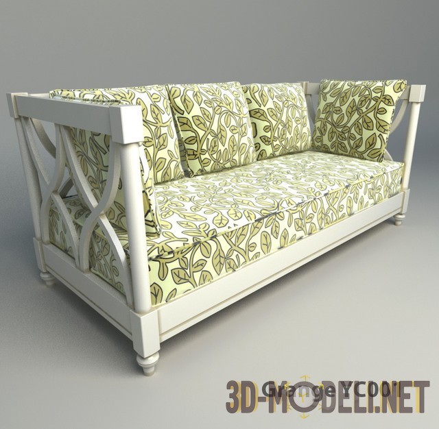 3d-модель небольшого дивана для отдыха, выполненного в стиле «Прованс». Романтичный и натуралистичный дизайн, присущий этому стилю, сквозит в каждом элементе дивана. Деревянный каркас покрыт светлым лаком, обивка сидения - бархатный текстиль с нежным рисунком на растительную тему. Текстуры и файл fbx присутствуют.