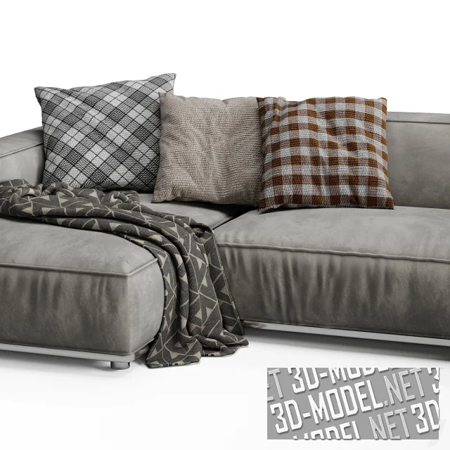 Угловой современный модульный диван в стиле Loft - Marechiaro от Arflex. Разработка 1976 года, не теряющая актуальность в наши дни. Сочетание серой с пятнами обивки и приглушенных сероватых текстур на декоративных подушках и пледе создают необходимое настроение. Конструкция модулей с низкими прямоугольными подушками сидений и невысокими прямыми спинками базируется на серебристых металлических площадках с невысокими ножками.