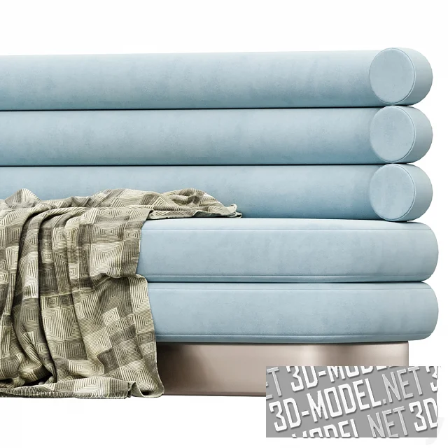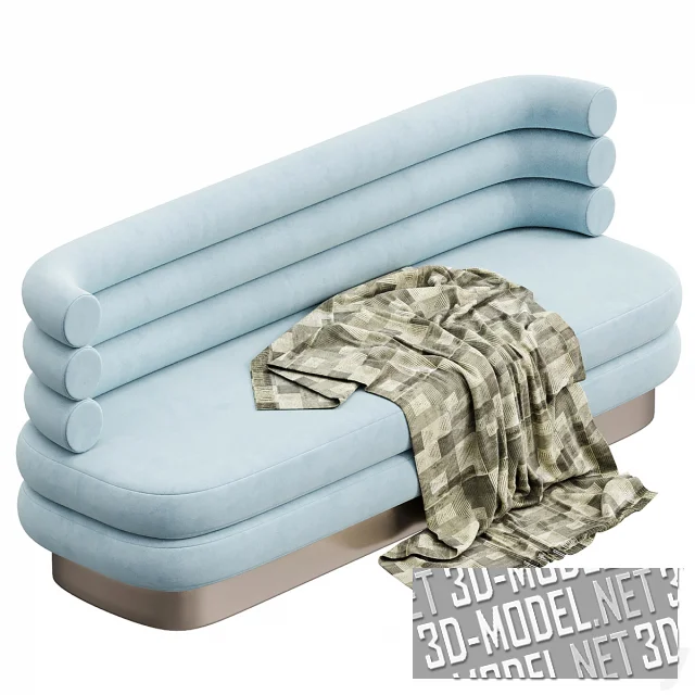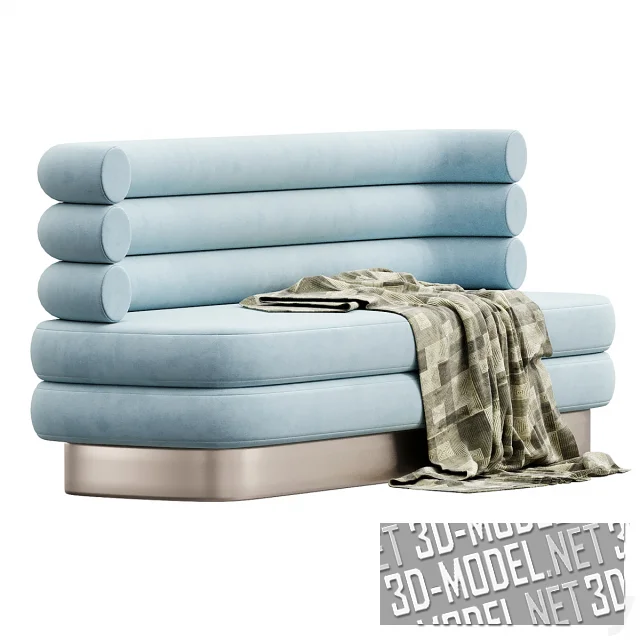 Оригинальный нераскладываемый диван Marshmallow в сочетании бледно-голубого и серебристо-серого. Корпус выполнен в виде двухслойной продолговатой прямоугольной подушки со скругленными краями и углами на серебристо-сером цоколе. Спинка «собрана» из трех горизонтальных цилиндрических мягких валиков с подвернутыми вперед концами. Обивка подушек сиденья и спинки - светло-голубой велюр. Габарит дивана: 210,1х71,1х87,8см. Модель дополнена пледом с серо-зеленым геометрическим паттерном.