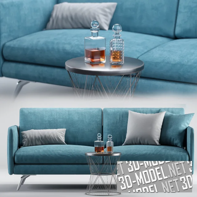 Прямой современный двухместный диван Osaka от BoConcept и круглый приставной металлический столик. Ножки дивана - серебристые, чуть изломанные, сужающиеся на концах. Прямоугольные подушки сидений и спинки, прямоугольные подлокотники и одна из декоративных диванных подушек обиты голубым текстилем. Еще две декоративные подушки - в чехлах светло-серого цвета. На столе с металлической столешницей и опорой из тонкого металлического прутка размещены два стеклянных графина с напитком.
