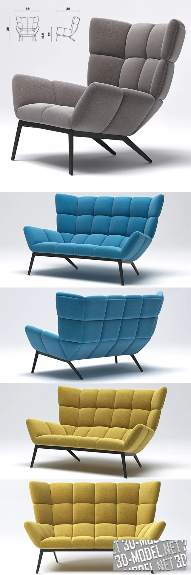 Двухместный диванчик и кресло Tuulla Loveseat (дизайнер: Jeff Vioski). Высокое мягкое изголовье с подворотами, невысокие подлокотники и сиденье состоят из отдельных мягких квадратных и прямоугольных сегментов, объединенных в целое. Текстильная обивка кресла и дивана выполнена из материала лаймового, голубого, розового и серого цветов. Мягкий корпус смонтирован на стальной раме с ножками. Рама и ножки выкрашены в черный матовый. Габарит кресла: 99х89х55,88см. Габарит дивана: 96,5х150х89см.