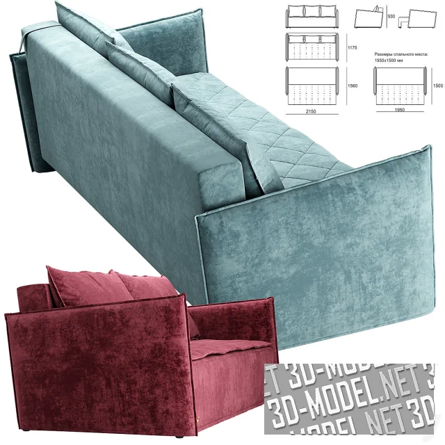 Современный прямой раскладной диван The JOY в стиле неоклассика. Габарит дивана в собранном состоянии: 93х117,5х215см. В разобранном: 215х156см. Размеры спального места в разобранном состоянии: 195х150см. Плоскость сиденья декорирована простежкой, делящей обивку на небольшие квадраты. Модели представлены в двух вариациях: с бордовой обивкой и с двумя подушками, с серо-голубой обивкой и тремя подушками.