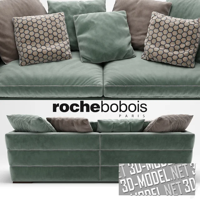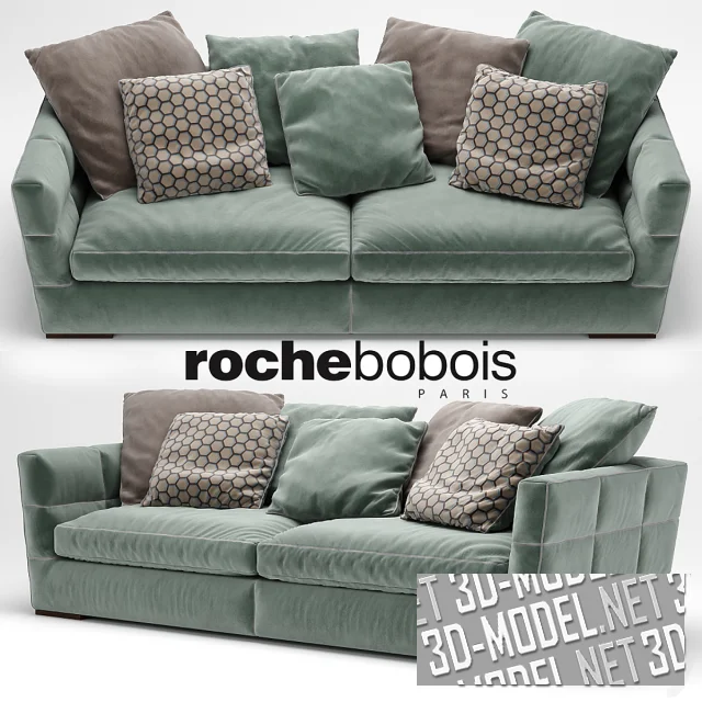 Современный четырехместный диван AVANT–PREMIERE от Roche Bobois. Велюровая обивка нежного, светло-шалфейного цвета. Боковые и задняя, чуть расширяющиеся кверху плоскости дивана декорированы светло-серыми контурами, разделяющими плоскости подлокотников и спинки на прямоугольные и квадратные клетки. Светло-серый контур декорирует и кромки двух прямоугольных подушек сиденья и трех (из семи) светло-шалфейных диванных подушек. Две подушки декорированы паттерном из шестигранных сот (темно-серого и голубого цвета по светлому фону). Еще две подушки серые.