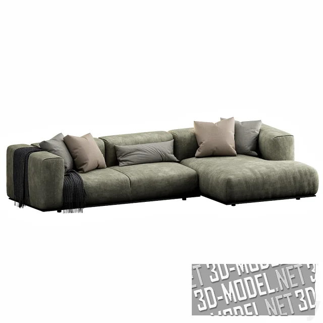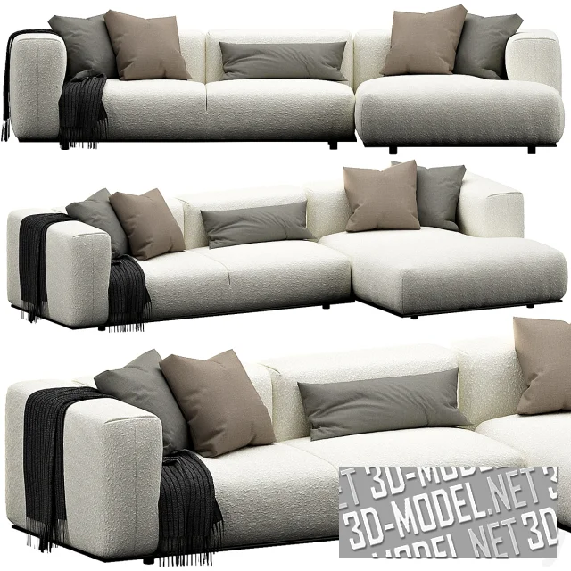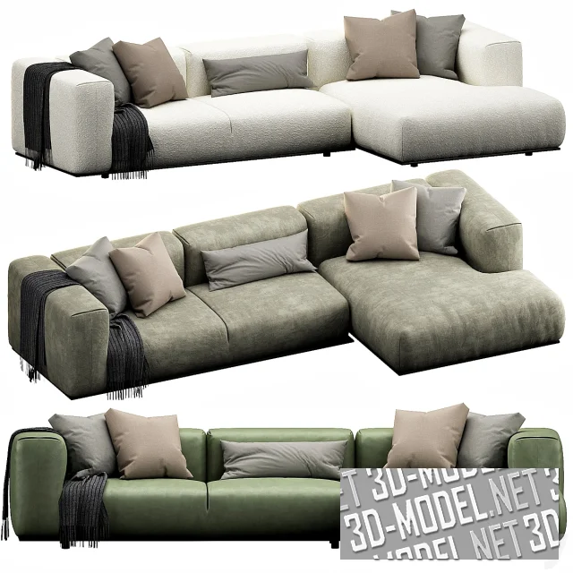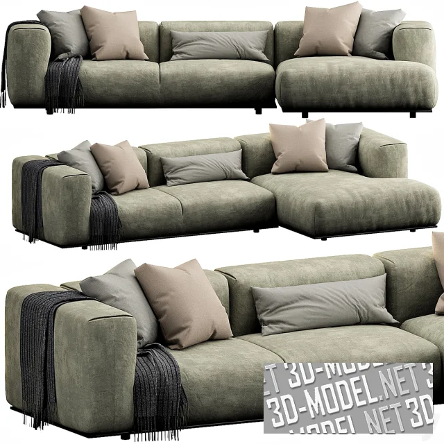 Современный диван с расширенной секцией-шезлонгом - Dambodue от B&B Italia (дизайнер: Piero Lissoni, 2024 год). Минималистичные прямоугольные мягкие элементы собраны в функциональную конструкцию с толстой набивкой и обивкой в трех вариантах: белое букле, рустикальная светлая серо-зеленая с разводами, светло-зеленая эко-кожа. Габарит дивана: 334х158х69см. Модель дополнена декоративными подушками в чехлах серого и бежевого оттенков и черно-серым пледом.