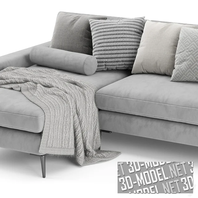 Современный минималистичный серый диван Article Nova 2, с расширенной секцией-шезлонгом, подушками и вязаным пледом. Велюровую обивку дополняют крупные белые прострочки. Габарит дивана: 290,4х148,7х81,9см. Несколько подушек в чехлах с мелкими геометрическими серо-белыми паттернами.