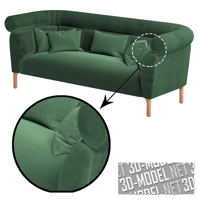 Прямой трехместный зеленый диван Roubel в стиле Chesterfield. Спинка и подлокотники выполнены в одной высоте и дополнены П-образным мягким валиком круглого сечения. Корпус установлен на невысоких деревянных ножках. Диван дополняют пять симметрично лежащих подушек в цвет обивки.