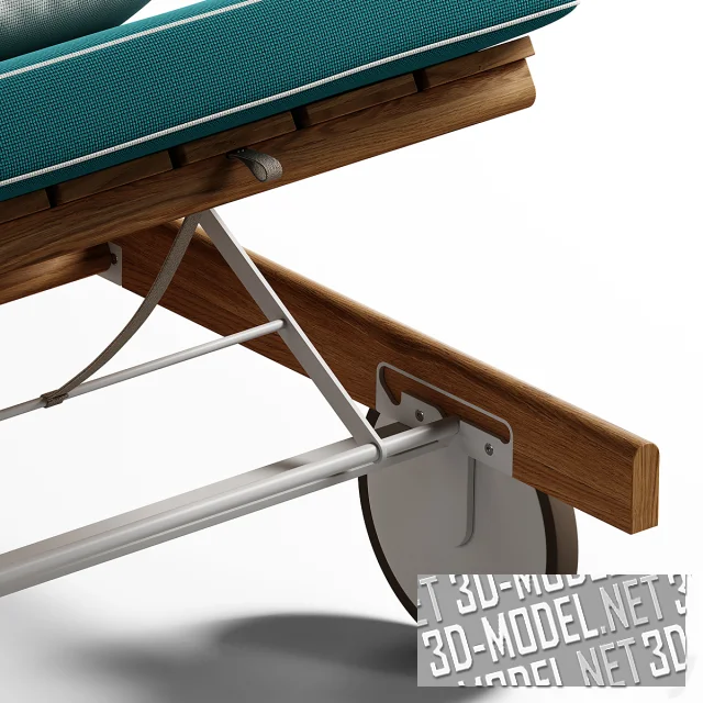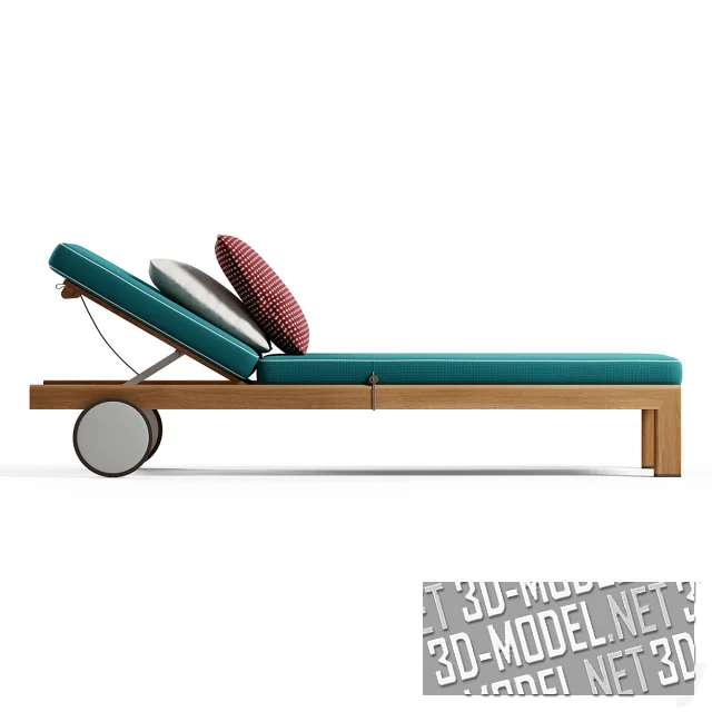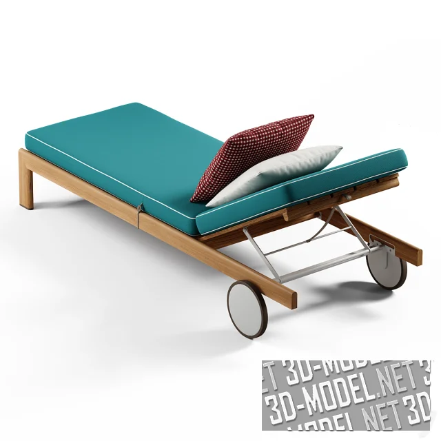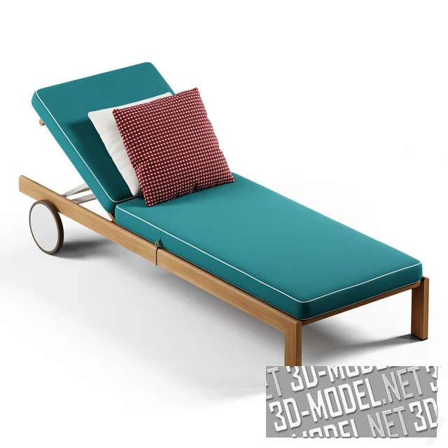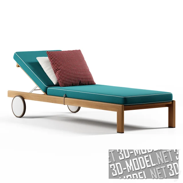 Современный шезлонг для террасы, пляжа, лужайки - Cassina от Rodolfo Dordoni. Рама выполнена из дерева. В ногах смонтированы две деревянные ножки. В изголовье на раме два колеса, позволяющие облегчить перемещение лежака. К деревянной раме прикреплены темно-бирюзовые прямоугольные подушки матраса, разделенные на две части. Кромки подушек матрасов декорированы белой вставкой. Шезлонг дополнен двумя квадратными подушками в белом и в темно-красную клетку чехлах.