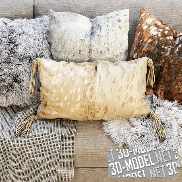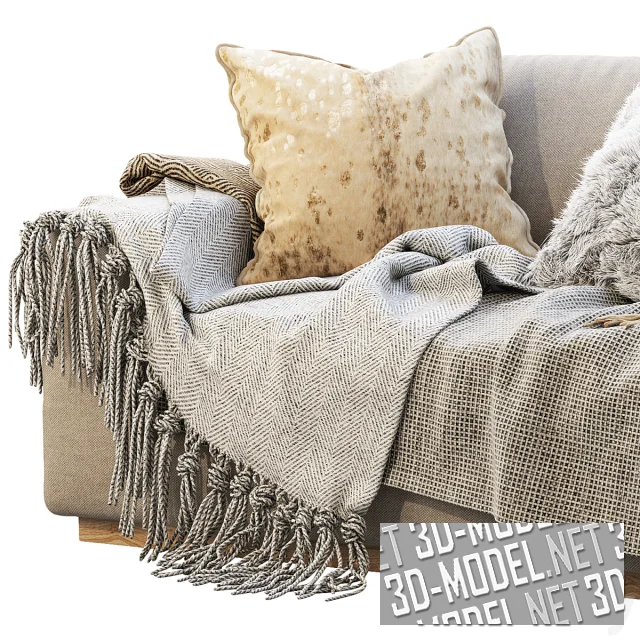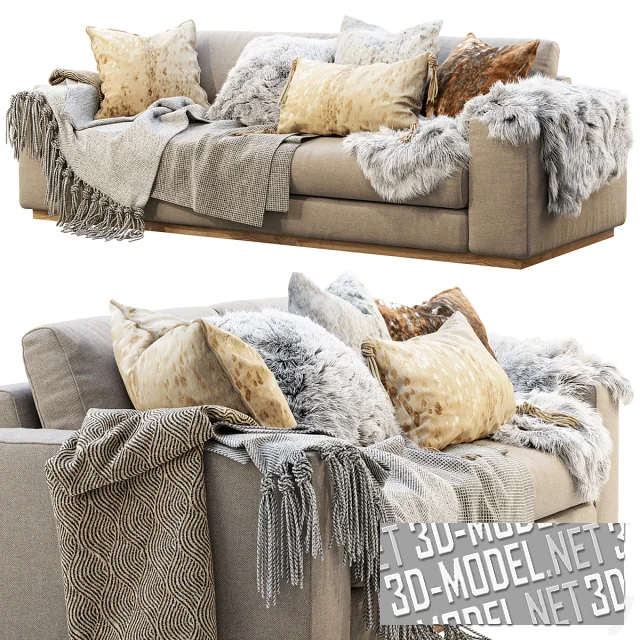 Современный прямой диван Noah от Roveconcepts, с пятью декоративными подушками, серыми пледами и «шкурой» из серого искусственного меха. Цоколь дивана - деревянная плита. Обивка прямоугольных элементов (сиденья, подлокотников и невысокой прямой спинки) - текстиль цвета льняного холста. Чехлы подушек напоминают кожу экзотических животных, в сочетании песочно-золотистых, серых и терракотовых тонов. Один из чехлов выполнен из серого искусственного меха.