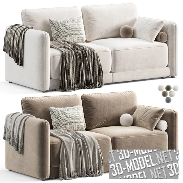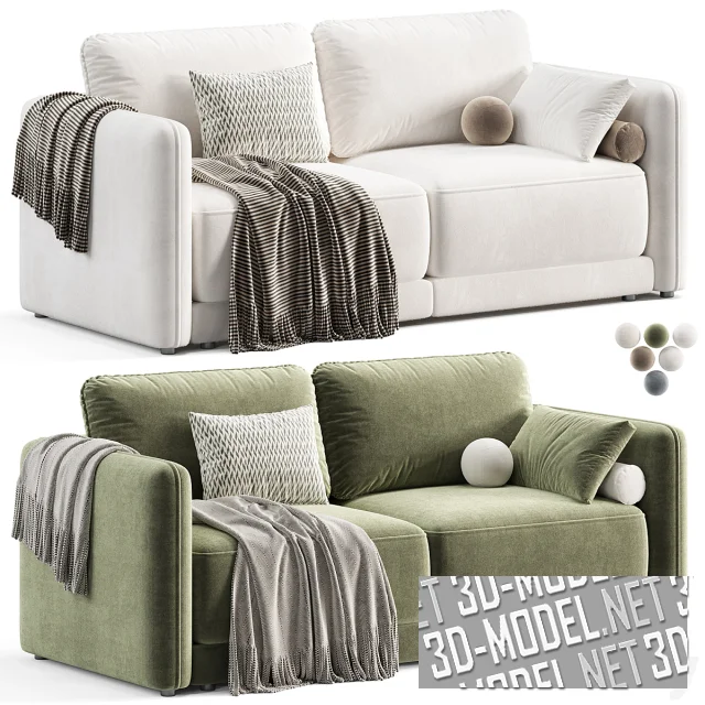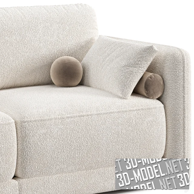 Современный прямой раскладной диван Marley от Dantone Home. Простые прямоугольные подушки и мягкие элементы подлокотников, спинки и сиденья смонтированы на невысоких цилиндрических ножках. Обивки представлены в шести вариантах: белое букле, серый, оливковый, бежевый, белый велюр и обивка цвета «слоновая кость». Диван дополнен серыми пледами, свободнолежащими подушками, мягким шаром и валиком. Одна из подушек - в пестром светлом чехле с мелким геометрическим орнаментом.