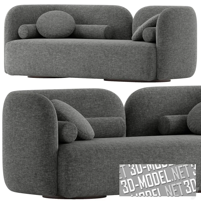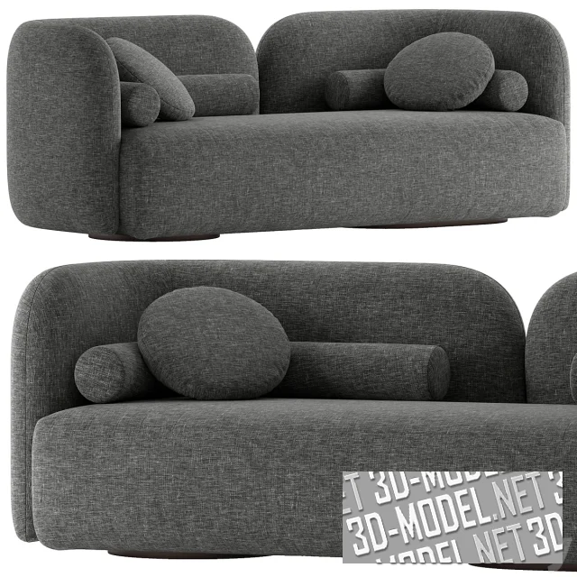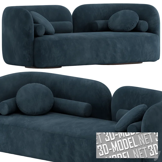 Современный прямой диван со скругленными угловыми элементами разделенной, невысокой асимметричной спинки - Georgina Modern. Сиденье прямое, высокое, мягкое. Основная конструкция дополнена двумя изогнутыми мягкими валиками круглого сечения и двумя круглыми подушками. Две круглые широкие низкие опоры выполнены из дерева. Обивка представлена в двух вариантах: серый меланж и темный, бледно-синий велюр. Габарит дивана: 73х210х86см.
