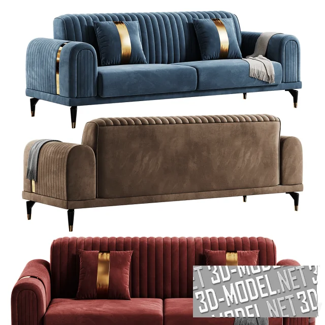 Современный диван FH 5020 Luxury Italian. Прямой корпус смонтирован на черных деревянных ножках с золотистыми наконечниками. В скругленных подлокотниках с арочным сечением вставка из полированного золотистого металла. Подобная золотистая вставка продублирована на двух квадратных подушках в чехлах из обивочной ткани дивана. Прямая спинка и подлокотники декорированы вертикальной прострочкой. Сиденье разделено на две подушки. На подлокотник наброшен серый плед. Обивка дивана представлена в нескольких вариантах велюра: светло-серый, темно-красный, коричневый, бледно-синий, черно-серый.