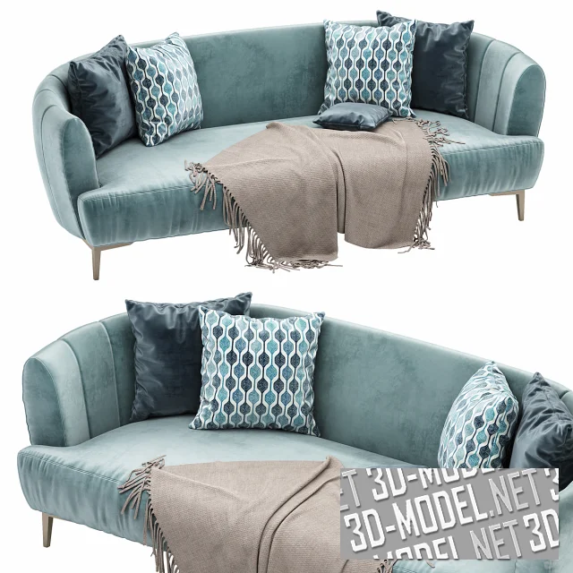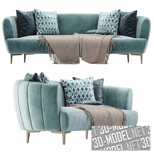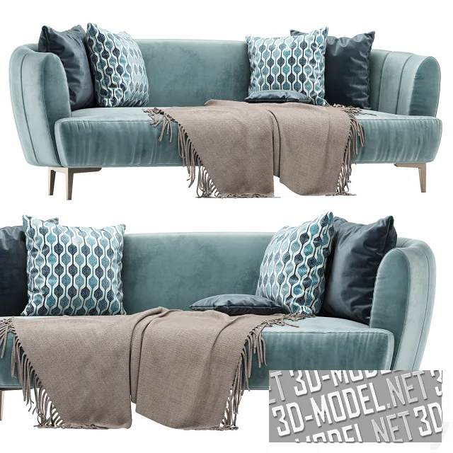Современный диван FULTON Theodore Alexander, с велюровой обивкой бледного серо-голубого цвета. Скругленный корпус смонтирован на четырех бежевых ножках. Невысокая спинка скругляясь, переходит в подлокотники. Боковые части этого элемента декорированы вертикальной прострочкой, разделяющей подлокотники и повороты спинки на пять широких панелей слева и пять справа. Габарит дивана: 233,7х95,5х78,8см. Дополнен бежевым пледом и четырьмя большими и одной маленькой квадратными подушками в черно-сине-зеленых и сине-бело-голубых чехлах с геометрическим орнаментом.