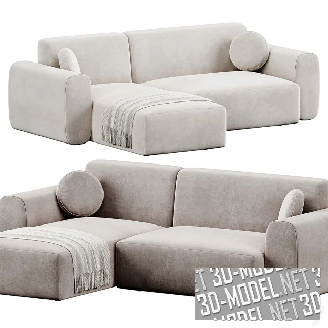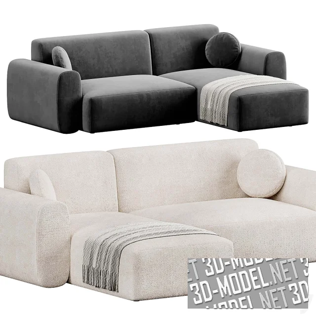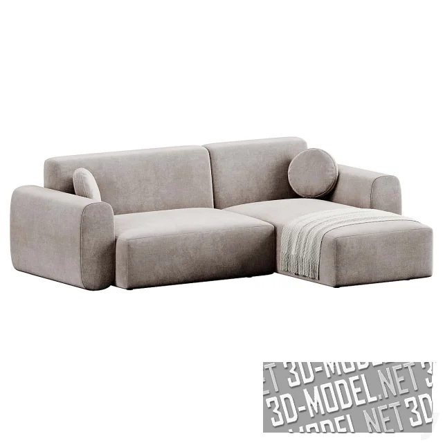 Современный прямолинейный угловой диван Cortegada с расширенной секцией-шезлонгом, парой круглых подушек в чехлах из материала обивки и бело-серым пледом. Высокие подушки сиденья, прямоугольные подушки подлокотников, прямоугольные подушки спинки обиты велюром (представлено четыре варианта: жемчужно-белый, светлое какао, темно-серый, светло-коричневый) или белой буклированной тканью.