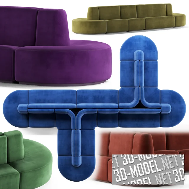 Современный модульный нелинейный диван для просторных помещений - Bistro от HMD INTERIORS. Благодаря особенностям конструкции U-образных, прямых и угловых модулей диван можно собрать в виде овальной двухсторонней конструкции, с перепендикулярным одним или несколькими ответвлениями в одну или в обе стороны. Мягкое сиденье и спинка с небольшим уклоном по фронтальной плоскости обиты велюром. Представлено несколько цветов: зеленый, бирюзовый, терракотовый, синий, фиолетовый, оливковый.