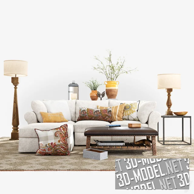 Современный белый диван с дополнительной квадратной секцией (коллекция: PB Air) с прямоугольным пуфом-столиком Caden Equestrian с обивкой из коричневой кожи на деревянном основании, напольным и настольным светильниками с деревянными точеными колоннами опор (Finn Turned Wood), декоративными подушками в стиле Бохо от Pottery Barn. Круглые абажуры светильников - белые, тканевые. К задней стенке дивана примыкает узкий белый столик с настольным светильником, крупными керамическими горшками с зелеными растениями и металлической фигуркой. Сцену дополняют книги, коробки, рог животного, металлический поднос.