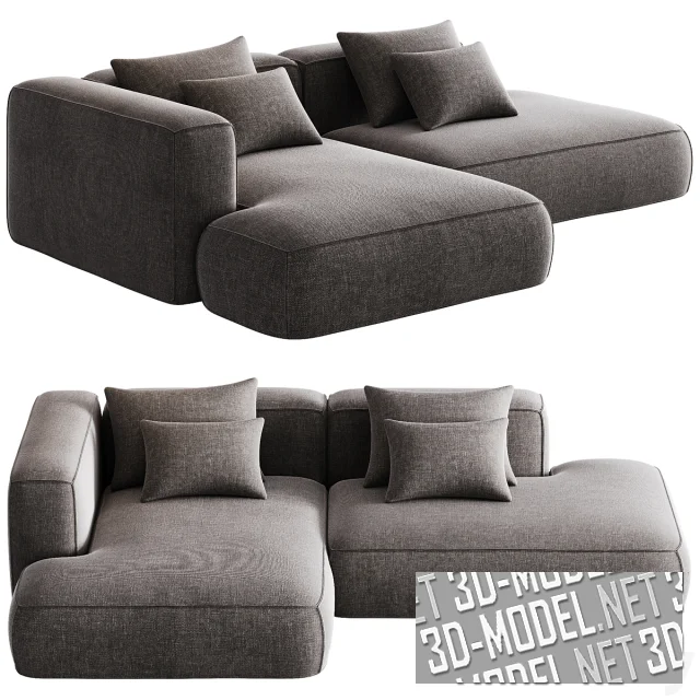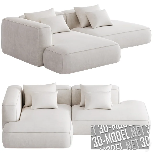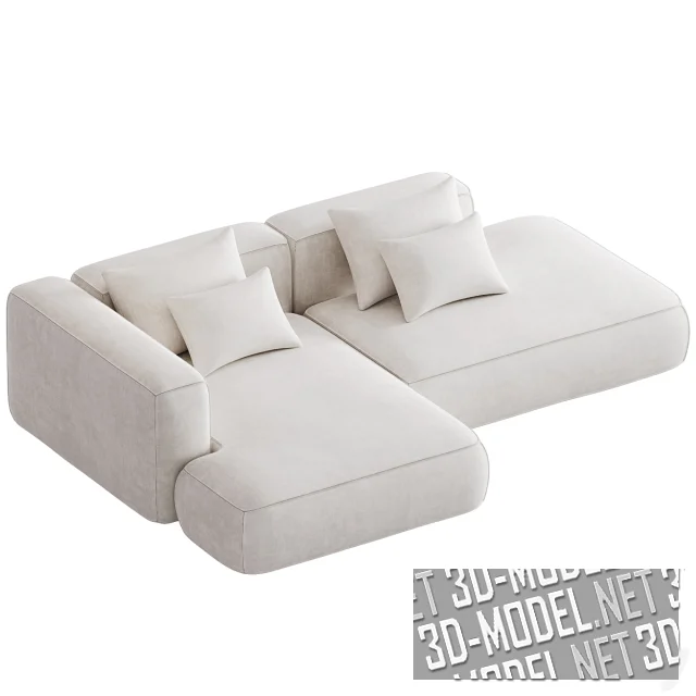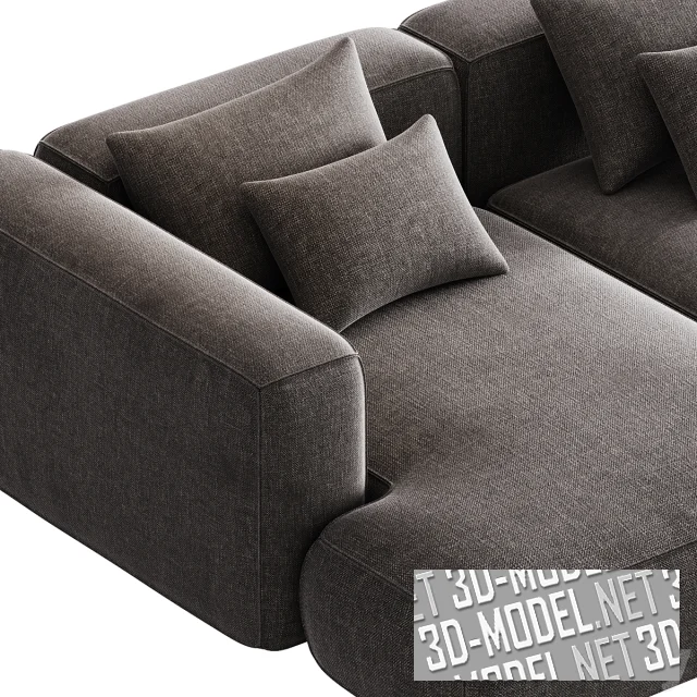 Современный компактный лаунж-диван Roxen от Mononova. Состоит из двух больших подушек сидения с низкой посадкой, соединенных перпендикулярно друг к другу, без ножек. Низкая прямая спинка из трех подушек (две составляющие угол и одна прямая), опирающихся прямо на пол. Диван дополняют две пары квадратных свободнолежащих подушек двух типоразмеров, в чехлах из материала обивки. Обивка представлена в двух вариантах: грязно-белый велюр и текстиль с текстурой льняного холста темно-серого цвета. Габарит дивана с учетом подушек: 164х247х67см.