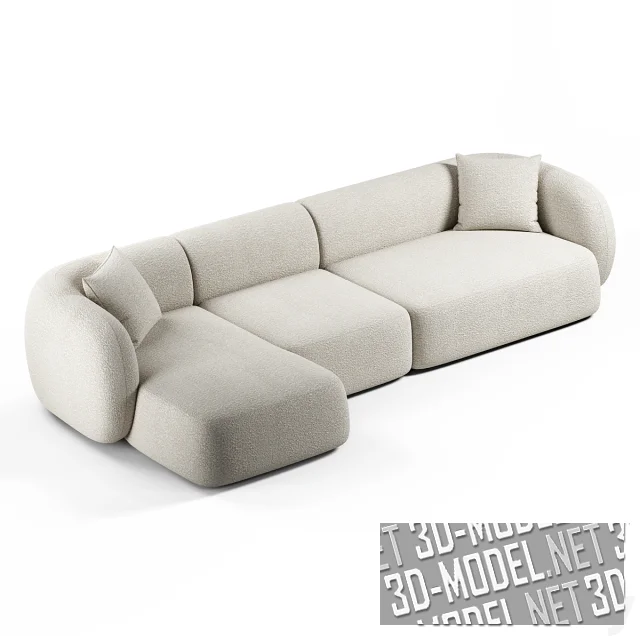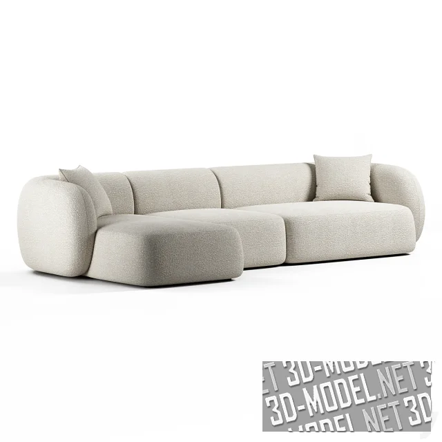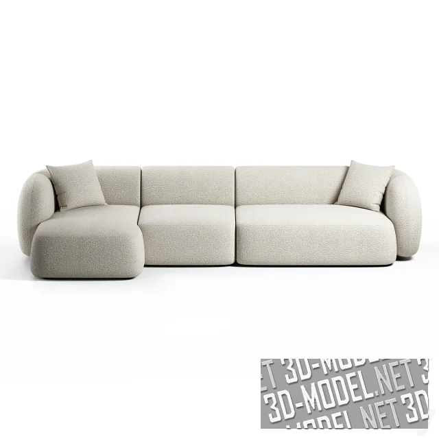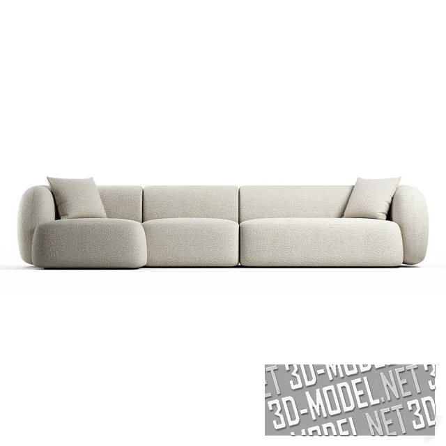 Современный буклированный четырехместный диван с расширенной секцией-шезлонгом - Martina от Kave Home. Профиль невысокой толстой спинки и подлокотников скруглен. Высокие подушки сидений, без видимых ножек, с узким теневым цоколем немного сужаются кверху, создавая ощущение массивного, надежного основания. Диван дополнен парой квадратных подушек, размещенных в углах.