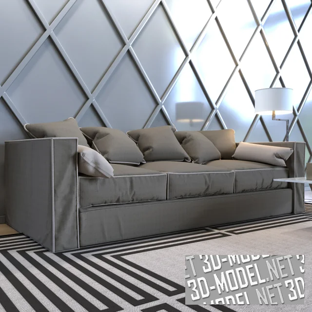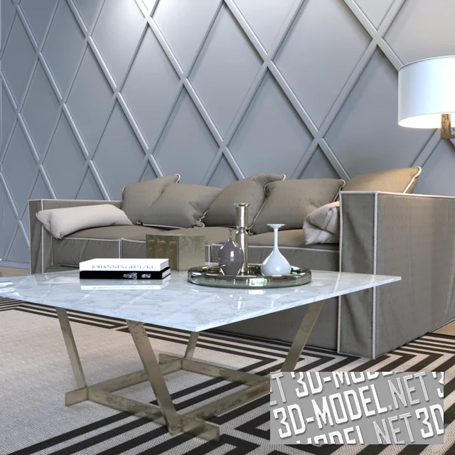 Комплект от CASAMILANO (Италия) для современной гостиной - журнальный столик Regent, диван Pillopipe, торшер, черно-серый прямоугольный ковер с минималистичным геометрическим орнаментом. Прямой диван с невысокой прямой спинкой и подлокотниками одинаковой высоты обит серым текстилем с толстым декоративным шнуром по кромкам. Дополнен несколькими квадратными свободнолежащими подушками в цвет обивки и двумя прямоугольными декоративными подушками светло-серого цвета. Габарит дивана без учета подушек: 240х104х63см.