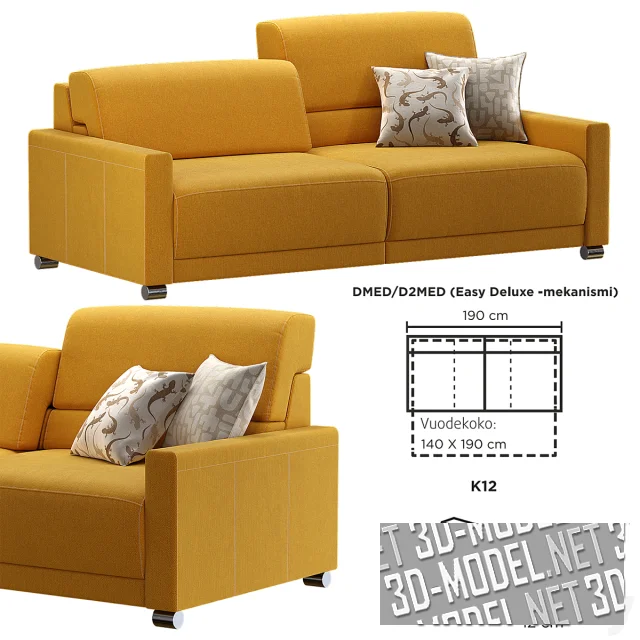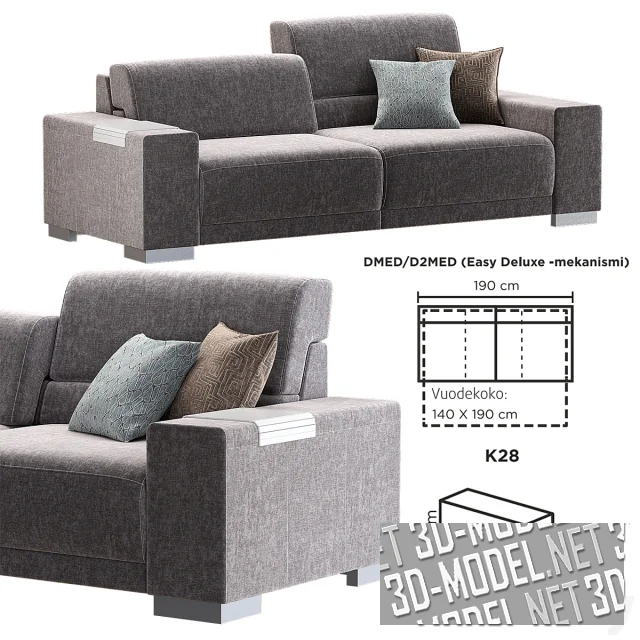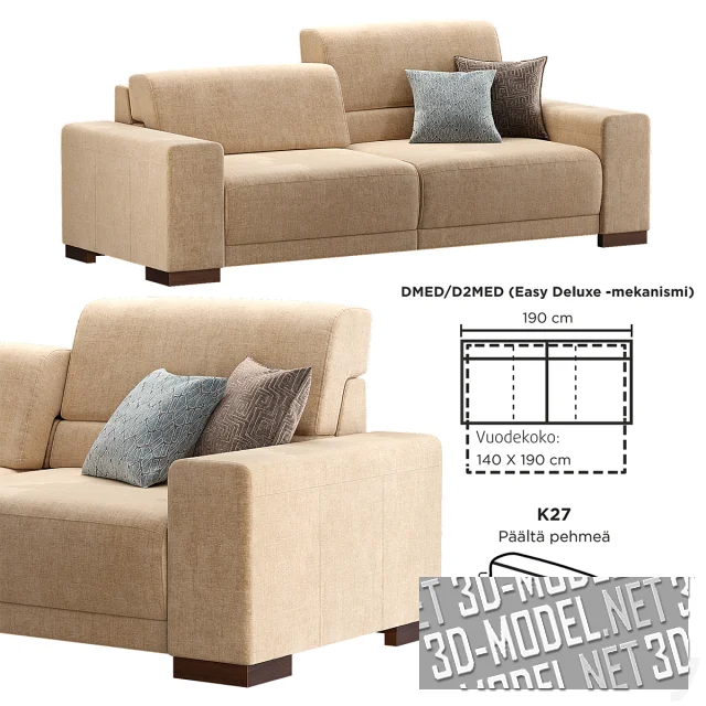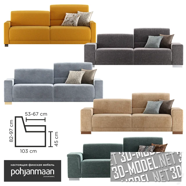 Небольшой современный раскладной диван с асимметричной спинкой - модель COPENHAGEN от Pohjanmaan Kaluste Oy (Финляндия). Невысокие прямые подлокотники и ножки представлены набором из нескольких вариантов разной толщины и материалов. База имеет габарит в собранном состоянии (без подлокотников) - 190х103х82/97см. Спальное место (в разложенном состоянии) - 140х190см.