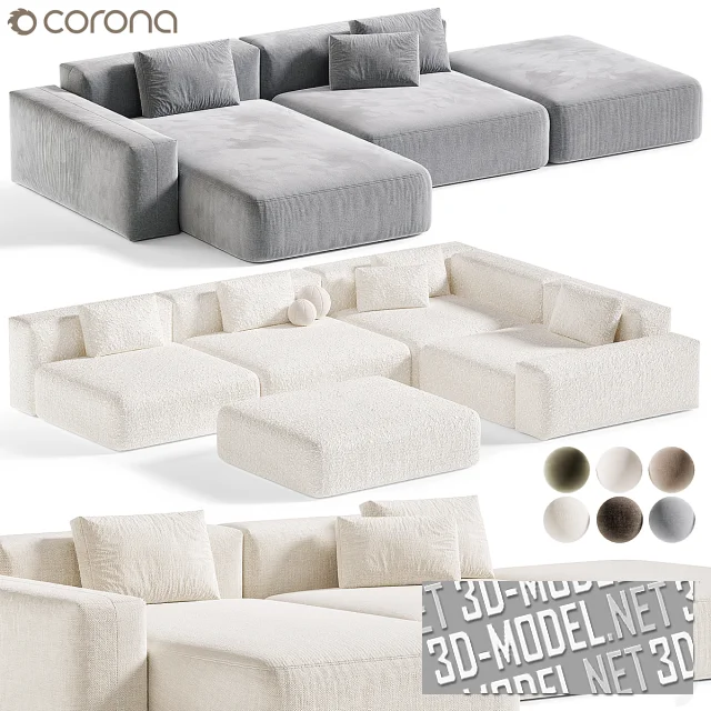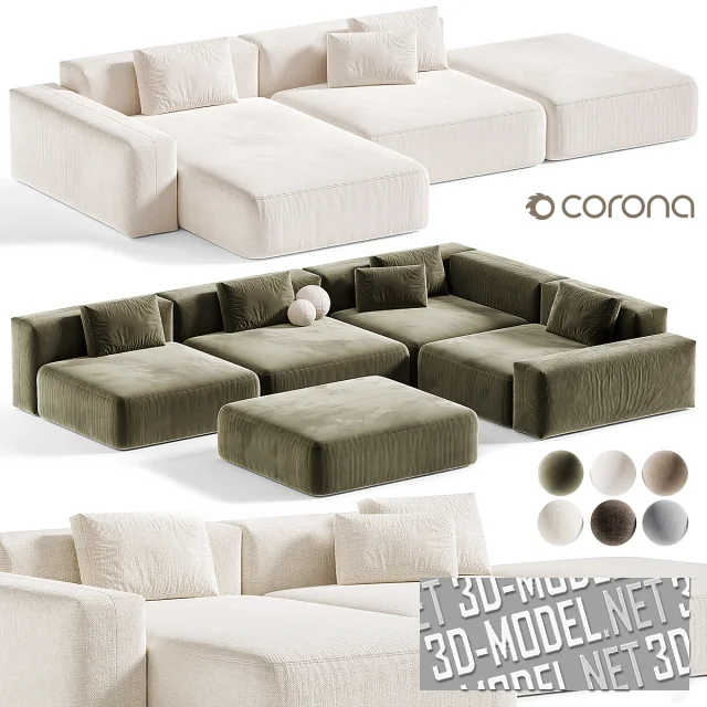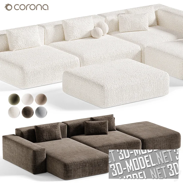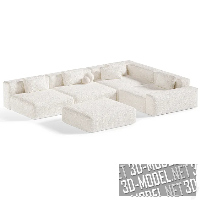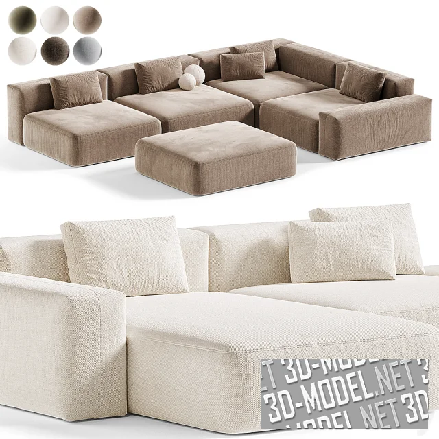 Современный диван BON ONE 33 от Raumplus. Модули квадратной и прямоугольной формы, без ножек. Содержат секции с невысокой прямой спинкой, со спинкой и подлокотником, угловую секцию, прямоугольный пуф и расширенную секцию шезлонг. Дополнен прямоугольными подушками в цвет обивки. Обивка представлена в нескольких вариантах: белый букле, велюр темно-бежевого, серого и оливкового цветов, текстиль белого и темно-коричневого цветов. Габарит дивана в максимальной комплектации: 380х300х70см.
