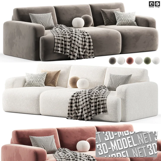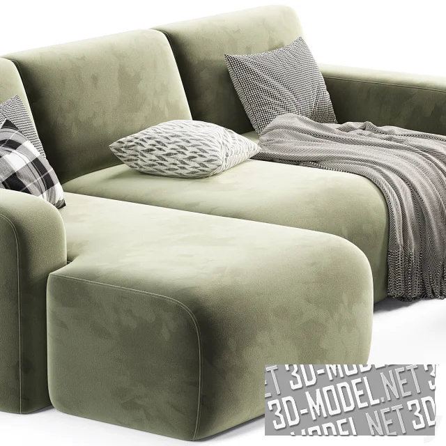 Современный диван Bonent от Divan.ru. Несколько представленных модулей с минималистичным силуэтом, без ножек и видимого цоколя (сиденье со спинкой, сиденье со спинкой и подлокотником с одной из сторон, удлиненное сиденье-шезлонг со спинкой, прямоугольный пуфик), позволяют конфигурировать различные варианты конструкции. Обивка дает возможность выбора текстуры и цвета. Это велюр (терракотового, серого, оливкового и белого цвета), белое букле, белый текстиль с крупной «вельветовой» текстурой. Диван дополняют пледы, квадратные и шарообразные подушки.