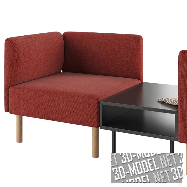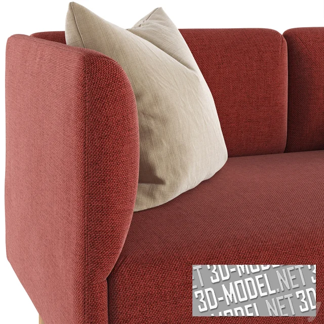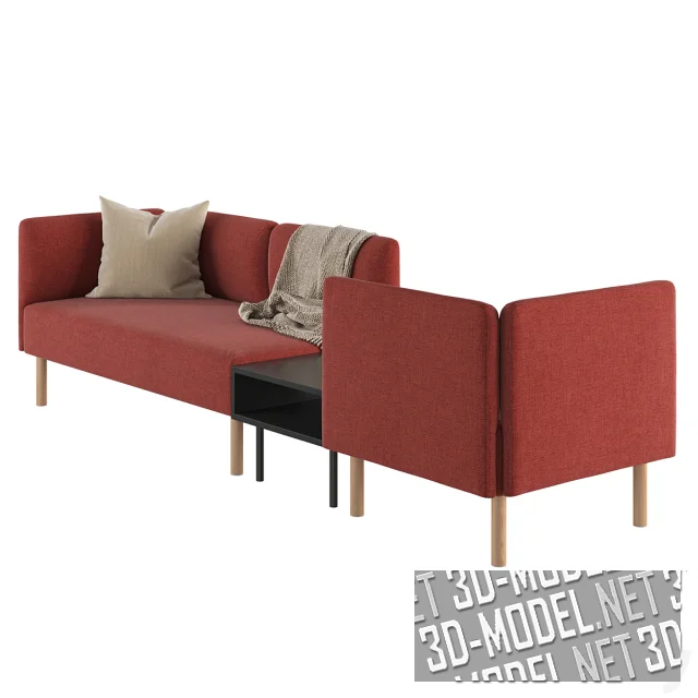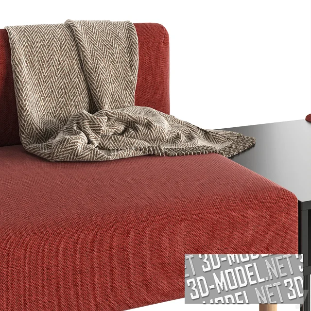 Современный трехместный диван в сканди-стиле - модель Lillehem. Конструкция включает три модуля: двухместная мягкая софа с угловой спинкой, одноместная секция с угловой спинкой и черный квадратный столик с полкой, интегрируемый между секциями. Мягкие секции, обитые терракотово-красным текстилем, смонтированы на цилиндрических деревянных ножках. Габарит дивана: 80х274х73см. Модель дополнена мягкой квадратной свободнолежащей подушкой в светло-бежевом чехле и пледом в коричнево-бежевую «ёлочку».