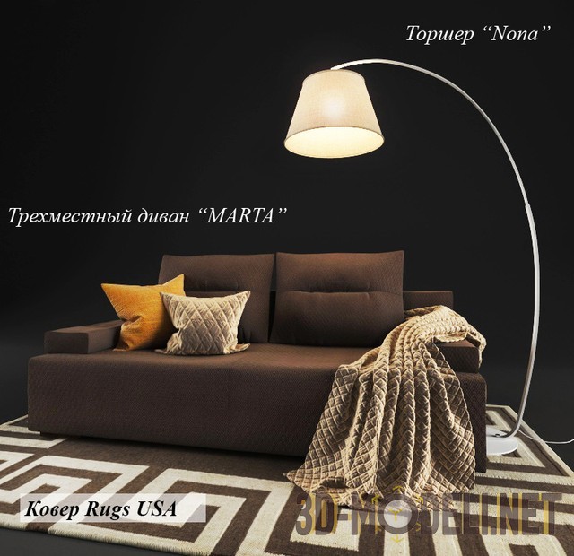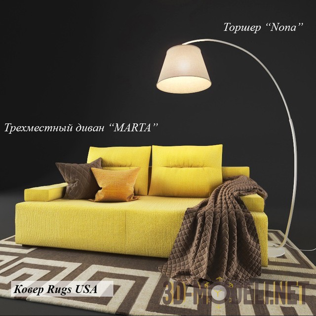 Предлагается три варианта обивки дивана – это желтый, зеленый и кофейный. В комплекте также находится ковер производства Rugs USA, размером 1530 х 2440 мм, и торшер «Nona». Габариты светильника: