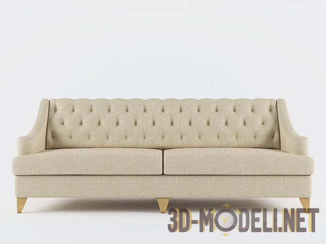 3D-модель трехместного дивана «Florio» от Marko Kraus. Диван классического стиля, обтянутый светло-бежевой однотонной тканью. На спинке классическая простежка капитоне. Изящные небольшие подлокотники начинаются от верха спинки и сужаются к сиденью. Диван стоит на шести маленьких конусообразных ножках, сделанных из светлого дерева. Размер: 244 х 94 х 95 см.