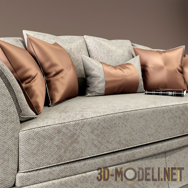 3D модель бежево-серого дивана с полукруглой спинкой и массивным основанием. Эту массивность смягчают оранжевые шелковые подушки, прислоненные к его спинке. В дизайне интерьера гостиной или библиотеки этот диван будет смотреться достаточно органично и живописно, благодаря стопке книг, лежащих рядом с диваном. Все текстуры есть.