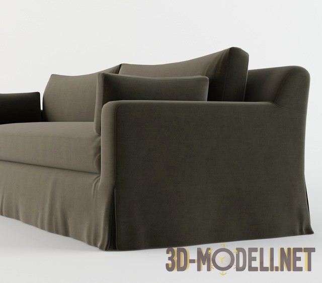 3D модель большого мягкого дивана с темной велюровой обивкой. Диван имеет современные формы, низкую спинку, как бы разделенную надвое, и две узкие подушечки, прислоненные к прямым подлокотникам. Этот диван прекрасно впишется в пространство гостиной, кабинета или холла, выполненного в современном стиле. Все текстуры есть.