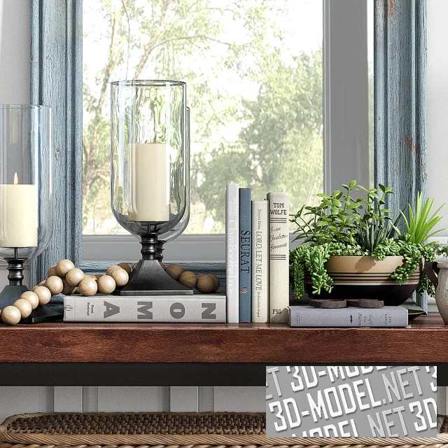 Кроме этого в композиции большая прямоугольная плетеная корзина с крышкой (AUBREY WOVEN BASKET), канделябры (CALEB HURRICANE - BLACK) с толстыми белыми свечами в стеклянных плафонах, книги, крупные деревянные бусы, широкий керамический горшок с суккулентами. Большим окном выступает в композиции крупное прямоугольное вертикальное зеркало в рустикальной облупленной голубоватой деревянной багетной раме.