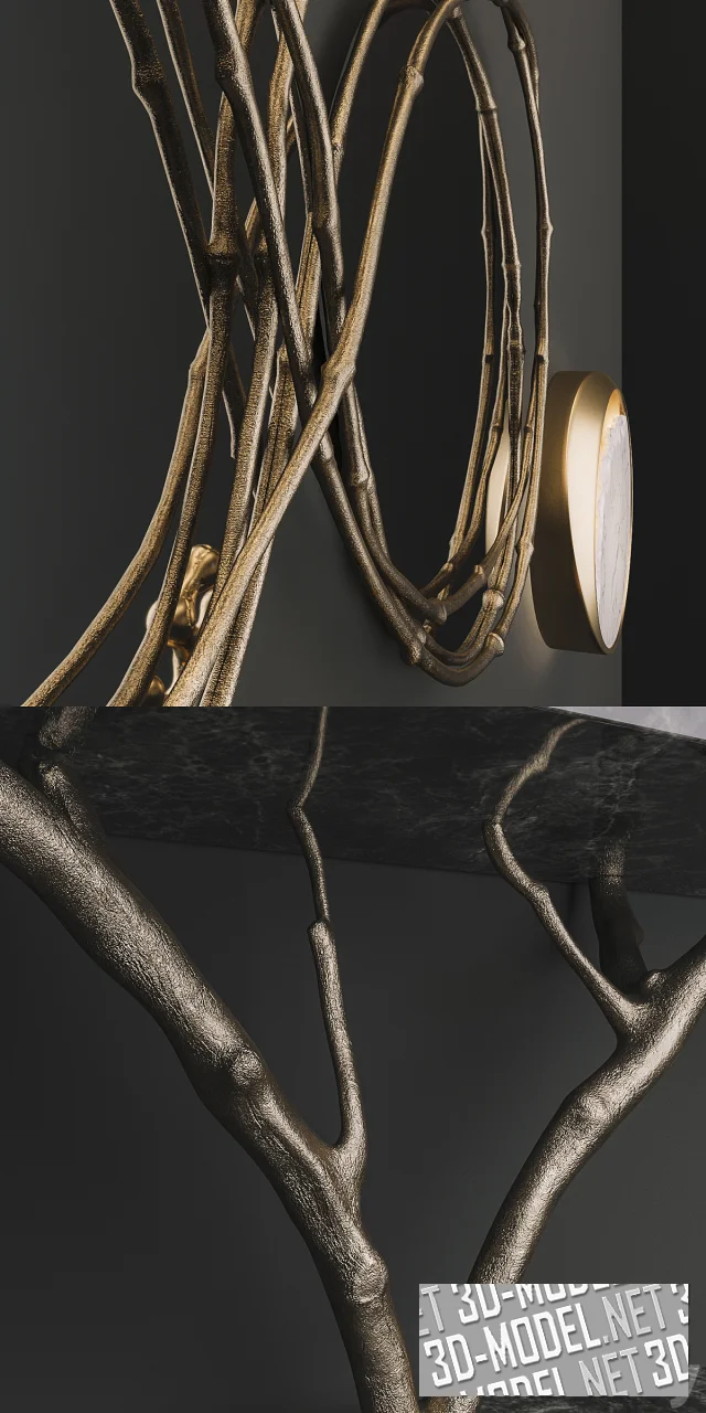 Опора консоли выполнена в виде крупной ветки, которая соединяет прямоугольную мраморную площадку и столешницу. Габарит: 180х50х81см. Криволинейные скругленные зеркала объединены латунной рамкой в виде виноградной лозы в три свободных слоя обрамляющей горизонтально расположенные стекла. Габарит триптиха: 180х63х4см. Настенные светильники в виде куска белого мрамора в золотистом кольце представлены в двух типоразмерах: d35 х 7см и d50 х 7см. Сцену дополняет абстрактная золотистая статуэтка, размещенная на столешнице консоли.