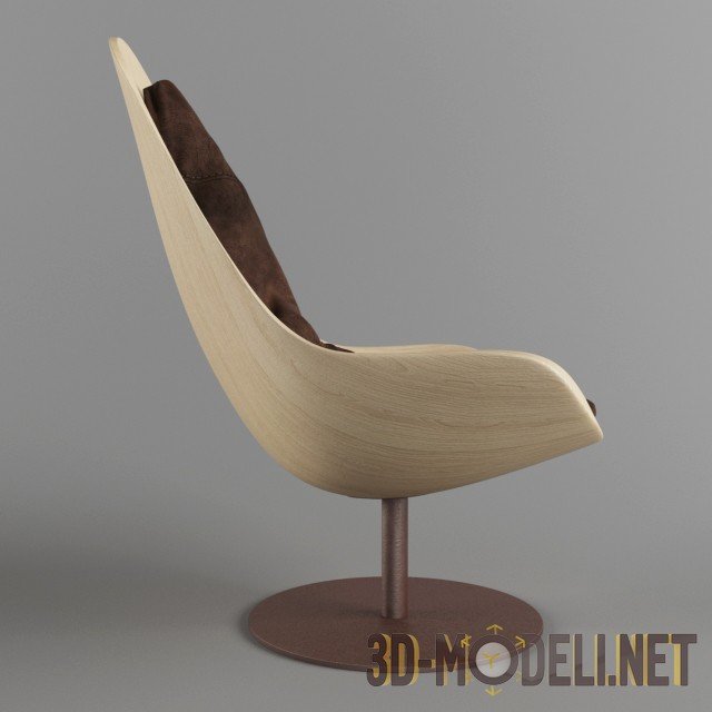 Легкое эргономичное кресло в современном стиле. Будто выточенное из цельного куска светлой древесины, углублённое сиденье с высокой спинкой закреплено на металлической стойке с круглым основанием, выкрашенной «молотковой бронзой». Для придания комфорта сидящему в кресле уложена вертикальная подушка, сшитая из кусков мягкой коричневой замши. Приятное сочетание цветов и материалов позволит этому креслу занять достойное место в современном интерьере эко-стиля.