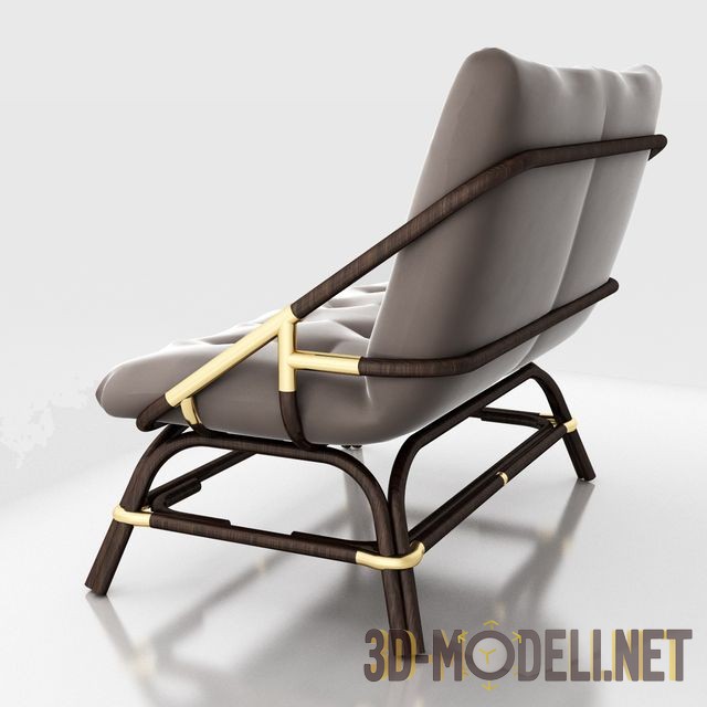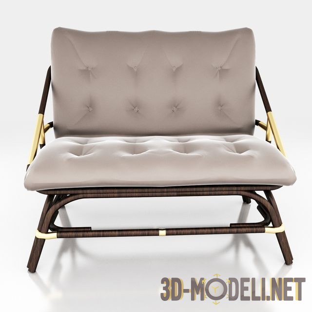 Широкое кресло с каркасом из ротанга. Мягкое сиденье и спинка простой прямоугольной формы декорированы четырьмя рядами втяжки. Обивочный материал бледно-песочного цвета. Каркас, ножки и подлокотники имитируют конструкции дачной мебели, сделаны из стволов ротанга. Плавные, закруглённые изгибы коричневых элементов конструкции соединены узлами, сваренными из золотистого цвета металлических трубок. Такое сочетание цветов и материалов позволяет применить это кресло в интерьерах в подходящем стиле, для обустройства террас, балконов, летних кафе и пр.