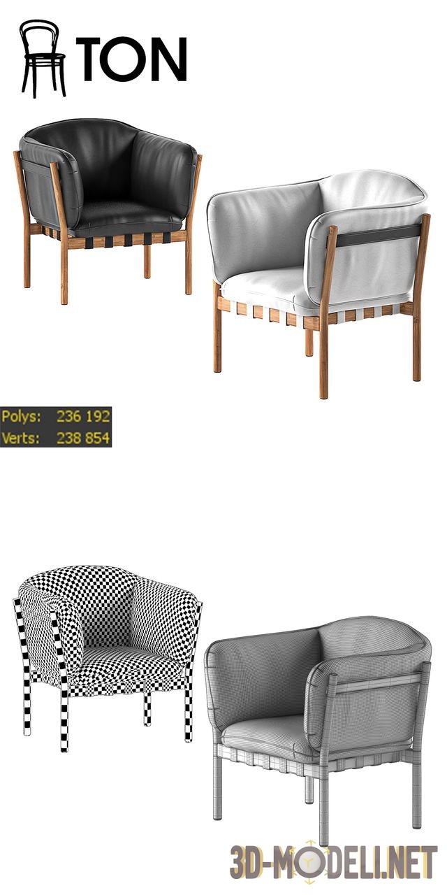 Кожаное кресло с подлокотниками Dowel от Ton. Это современное и удобное кресло с кожаной обивкой, подчеркивающей его круглые формы. Помимо использования в лобби, зонах чилл-аута или кафе, кресло будет отлично смотреться в частном интерьере. Габаритные размеры: 85 x 45 x 52 см. Архив содержит два варианта кресла, с разными цветами кожи (белая и черная).