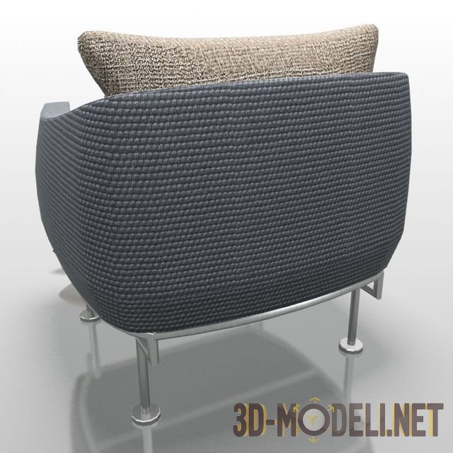 Кресло на ножках, с тремя подушками – розовой и двумя бежевыми. Основа кресла с высокими подлокотниками серая с крупной текстурой. Ножки выполнены из хромированной трубы, изготовленной в виде зигзагов и круглыми пятаками внизу. Кресло подойдёт в различные интерьеры. Модель отличает реальный масштаб и точные пропорции.