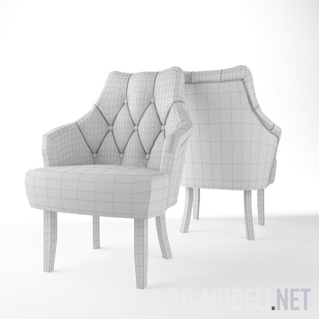 Кресло в классическом стиле. Спинка вогнутая, переходящая в подлокотники, декорирована каретной обивкой. Материал обивки спинки и сиденья – бледно–бежевая ткань. Изюминкой кресла является принт из вертикальных рустикальных полосок оттенков белого и красно–розовых цветов на задней плоскости выгнутой детали спинки и подлокотников. Ножки кресла деревянные, коричневые. Габариты кресла: 650 x 650 x 890.