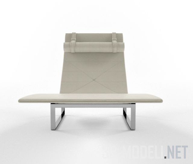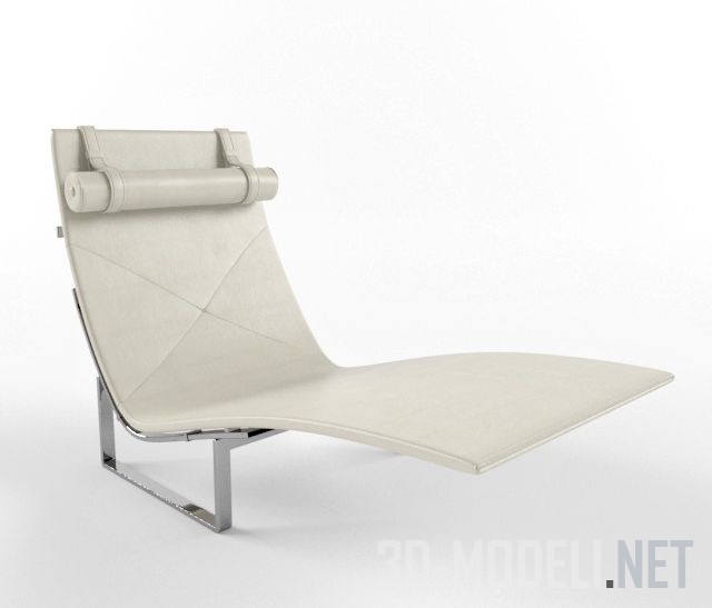 Стильный современный шезлонг PK24 от Fritz Hansen. Плоскость шезлонга обтянута белой кожей и декорирована декоративной прострочкой. В верхней части спинки подвешен валик на ремнях. Ножки шезлонга изготовлены из хромированной металлической полосы и соединены с конструкцией основы, имеющей возможность регулировки наклона спинки.